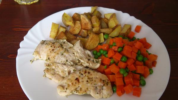 Já dělám zapečené ( kotlety, prsa, krkovice, co máte...) na kostičky na oleji osmahnu s grilovacím kořením, dle chuti co kdo má rád, trochu pepře, kari, je to na vás.