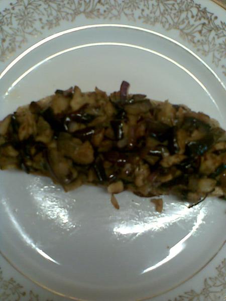 Plátky lilku po "vyplakání" opečeme na kapce olivového oleje, vyndáme z pánve a osušíme. Nakrájíme na drobnější kousky. Na pánvi orestujeme červenou cibuli a česnek nakrájený nadrobno, vrátíme do pánve lilek, osolíme, opepříme, ochutíme tamari omáčkou a můžeme ještě prokápnou olivovým oleje. Podáváme teplé na žitném chlebu.