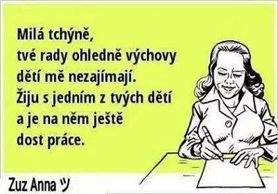 Ja patrim k tem drzym takze kdyby mi nekdo rekl co a jak mam delat tak ho na vterinu poslu do haje. Jsem uz par let dospela takze myslim ze si uz umim rozhodnout co a jak chci a co a jak nechci a zkuste mi do toho nekdo krafat!!! S mamkou nemam uplne 100% vztah takze tu poslu do tmy "ajncvaj" (a nekdy jeste rada 😅 😀 ) a i kdyz s tchyni mam naopak super vztah tak i ji umim rict ze tohle ted proste ne!