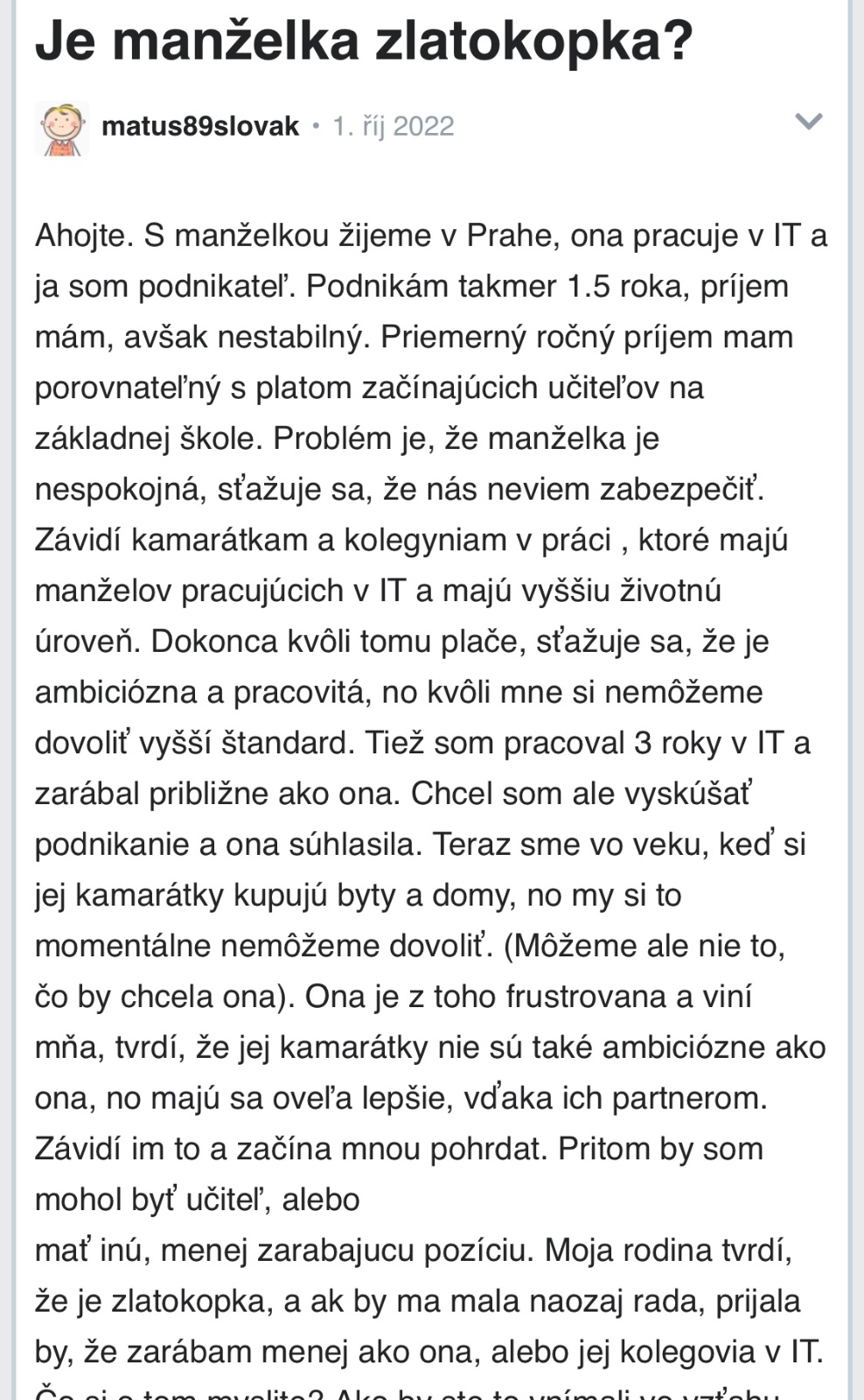 Ahojte. Mám 34 a maželka 29. Problém je, že by som si už vedel predstaviť mať deti, známi v mojom veku už majú aj 2-3 deti a ja som veľmi rodinne založený a neviem si prestaviť život bez detí. Manželka má ale opačný názor. Tvrdí, že sa na deti necíti a chce sa najprv zabezpečiť. Zároveň som 2 roky rozbiehal podnikanie, tým pádom bol môj príjem nestabilný, nemáme nehnuteľnosť ani auto, úspory nemáme vysoké ale nasporené niečo máme, vďaka manželke. Auto a nehnuteľnost by sme si pokojne mohli kúpiť, aj keď byt by sme mali na 30 ročnú hypotéku a maximálne by sme si mohli dovoliť staršiu 3+kk. Manželka má stabilnú prácu, mne sa podnikanie rozbehlo a príjem mám stabilný, aj keď nie vysoký ( cca 35.000 Kč, bývame v Prahe). Podľa mňa je to dostačujúci príjem na založenie rodiny, veď mnoho mladých ľudí nemá na účte milióny keď zakladá rodinu. Manželka si to ale nemyslí, tvrdí, že chce mať pocit, že má vo mne istotu, že ju ako manžel dokážem finančne zabezpečiť. (čo podľa mňa dokážem, aj keď to nie je luksus). Som z toho sklamaný, deti by som chcel. Manželka naopak tvrdí, že ak by mala pocit finančnej istoty, deti by si vedela prestaviť. Podľa mňa je veľmi náročná. Rodina je dôležitejšia ako majetky a postupne by sme sa zabezpečili, ak by sme obaja pracovali. Ona chce byť najprv poriadne zabezpečená, mať splatenú aspoň 1/3 hypotéky, auto bez pôžičky, až potom mať deti.Občas rozmýšľam, či by mi nebolo lepšie so skromnejšou ženou. Som z toho frustrovaný. Čo si myslíte? Je manželka náročná, alebo som len ja nezodpovedný?