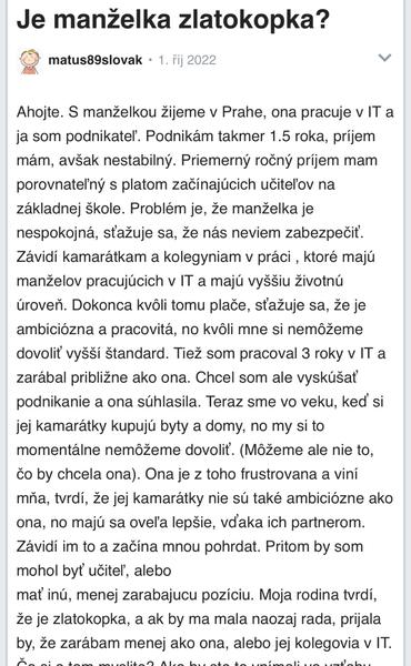 Tady mi přijde, že zakladatel diskuse chce děti, protože je mají všichni kolem, neřeší, z čeho budou jako rodina žít, sám si dělá práci, která ho naplňuje, ale rodinu nezajistí a od ženy očekává, že ona se své práce vzdá, porodí mu blíže neurčený počet dětí a v roce nejmladšího pošupajdí zpátky do práce, aby mohla dětem koupit aspoň boty, protože z jeho platu na to nebude. Rezervy mají jen díky ní a on ji ještě označí za zlatokopku? Jako sorry, ale tohle není vhodný materiál pro zakládání rodiny...