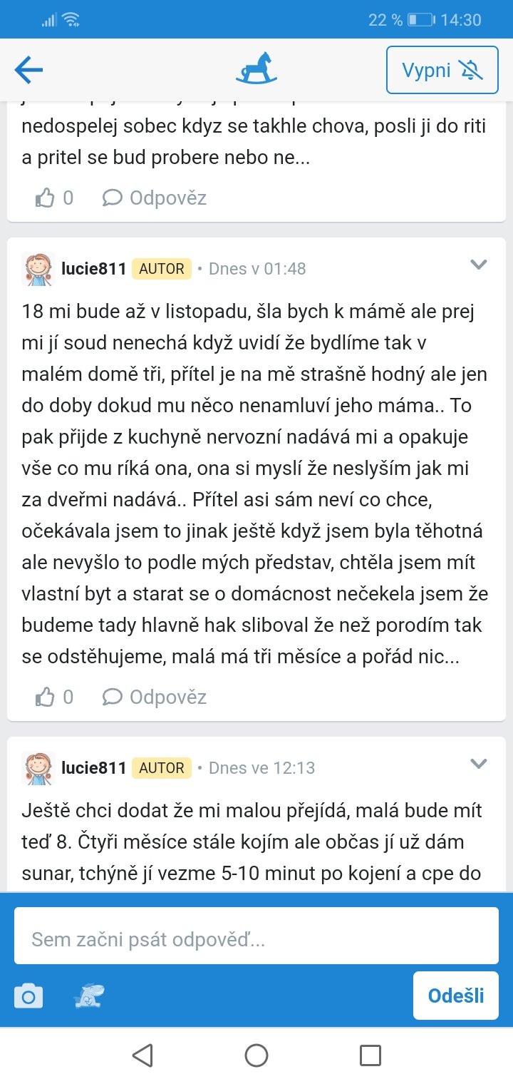 18 mi bude až v listopadu, šla bych k mámě ale prej mi jí soud nenechá když uvidí že bydlíme tak v malém domě tři, přítel je na mě strašně hodný ale jen do doby dokud mu něco nenamluví jeho máma.. To pak přijde z kuchyně nervozní nadává mi a opakuje vše co mu ríká ona, ona si myslí že neslyším jak mi za dveřmi nadává.. Přítel asi sám neví co chce, očekávala jsem to jinak ještě když jsem byla těhotná ale nevyšlo to podle mých představ, chtěla jsem mít vlastní byt a starat se o domácnost nečekela jsem že budeme tady hlavně hak sliboval že než porodím tak se odstěhujeme, malá má tři měsíce a pořád nic...