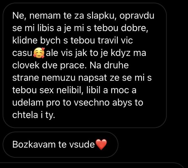@hanka_333 lhal ji, ale ne ve vsem. Prace ma dve, to je fakt. Psal ji veci ze soukromi, sduveroval se ji, akorat s tim ne, ze ma manzelku. Ale jinak asi se vsim, posilal ji fotky z naseho bytu. Kdyz na to prisla ze nekoho ma a samozrejme mu zacala nakladat ze je hajzl, neskutecne se ji omlouval a ze i kdyz vi ze ho ted znenavidela, i tak si s ni kdykoliv moc rad napise ale uz jen jako kamarad. Ale ze chape kdyz ona uz nebude chtit. V podstate se s ni rozesl a pak si ji i zablokoval ale jesti na ni porad mysli, to nevim.