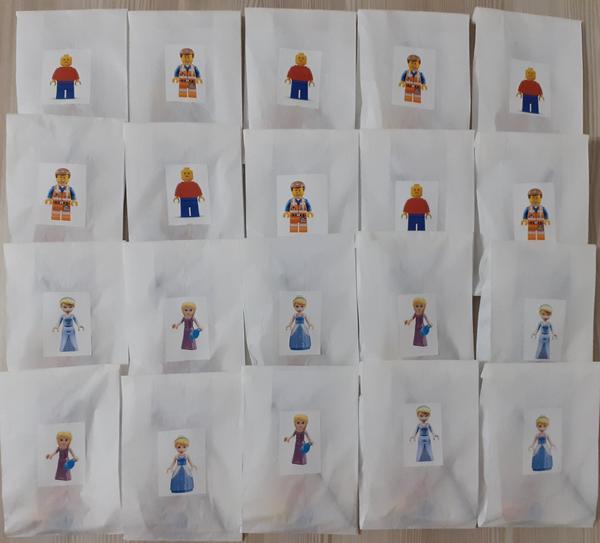 Tak u nás ve školce se nesmělo konzumovat nic, co nebylo koupené a originálně zabalené z důvodu hygieny. Měla jsem snahu kupovat ořechy, datlové "bonbony" a zeleninové chipsy, ale paní učitelky mě poprosily, ať raději nekupuji nic, že děti to nejí a jim je to líto vyhazovat. Nakonec jsem dětem připravovala tématické balíčky s nějakými drobnostmi. Třeba když měl syn Lego oslavu, tak takto (ten malý lego panáček je ze samotvrdnoucí hmoty).