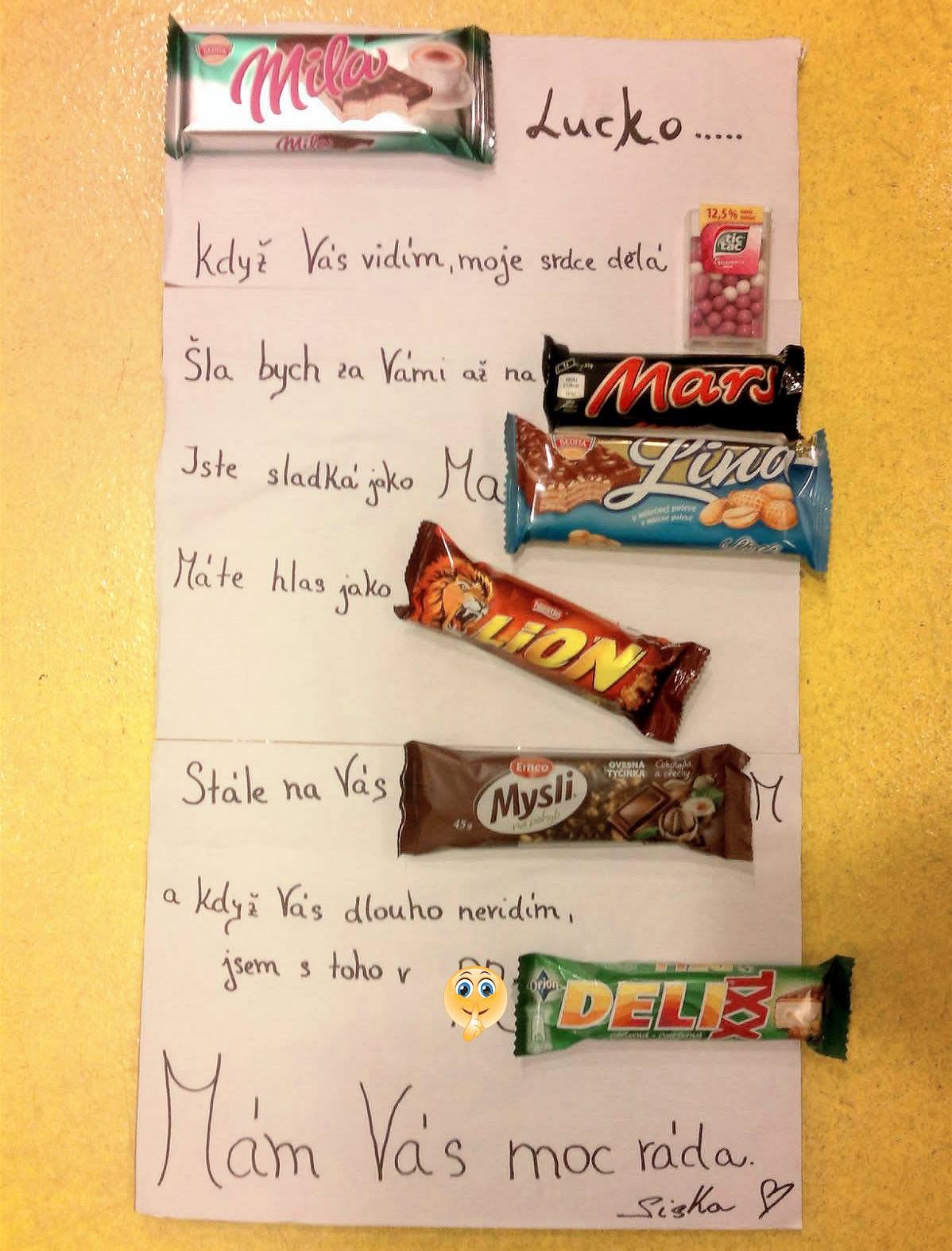 Holky,prosím Vás dělala některá z váš takové ty plakátky se sladkostmidoplněné o text?? Jak je tam třeba LION a ktomu je dopsaný milion,nebo jsou tam zlaté polomáčené je tam dopsané zlaté srdce.oplatky MILA jako miláček...máte prosím nkdo nejaké tipy?potřebuji nějakou romantiku a něco k narozeninám pro mamku.poradíte?