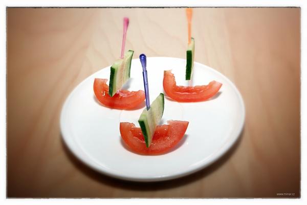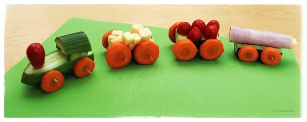 Synvoi jsem (tedy k 2.narozeninám) děla vláček se zeleniny (rybníček z dipu) a dělala jsem ježka z hrušky a hroz. vína - na půlku hrušky jsem napíchala párátka a na ně hroz. vína - velký úspěch to měli i u dospělých a halvně u mého milovníka vláčků 🙂.
