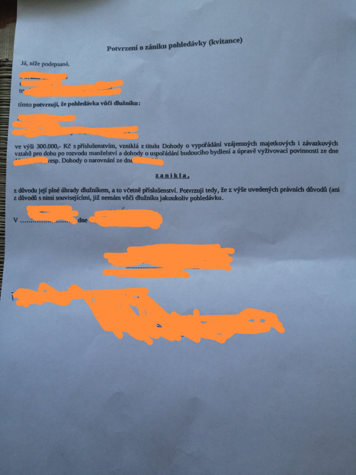 Mám prosím dotaz... Můj partner obdržel od právníka své exmanzelky kvitanci, ohledně vypořádání po rozvodu, kdy ex vyplatil, tak jak bylo stanoveno v návrhu na rozvod. Toto vše je v pořádku, žádné finance ji již nedluží, avšak v návrhu rozvodu stálo, že ji má vyplatit určitou částku, rozdělení majetku, atd.