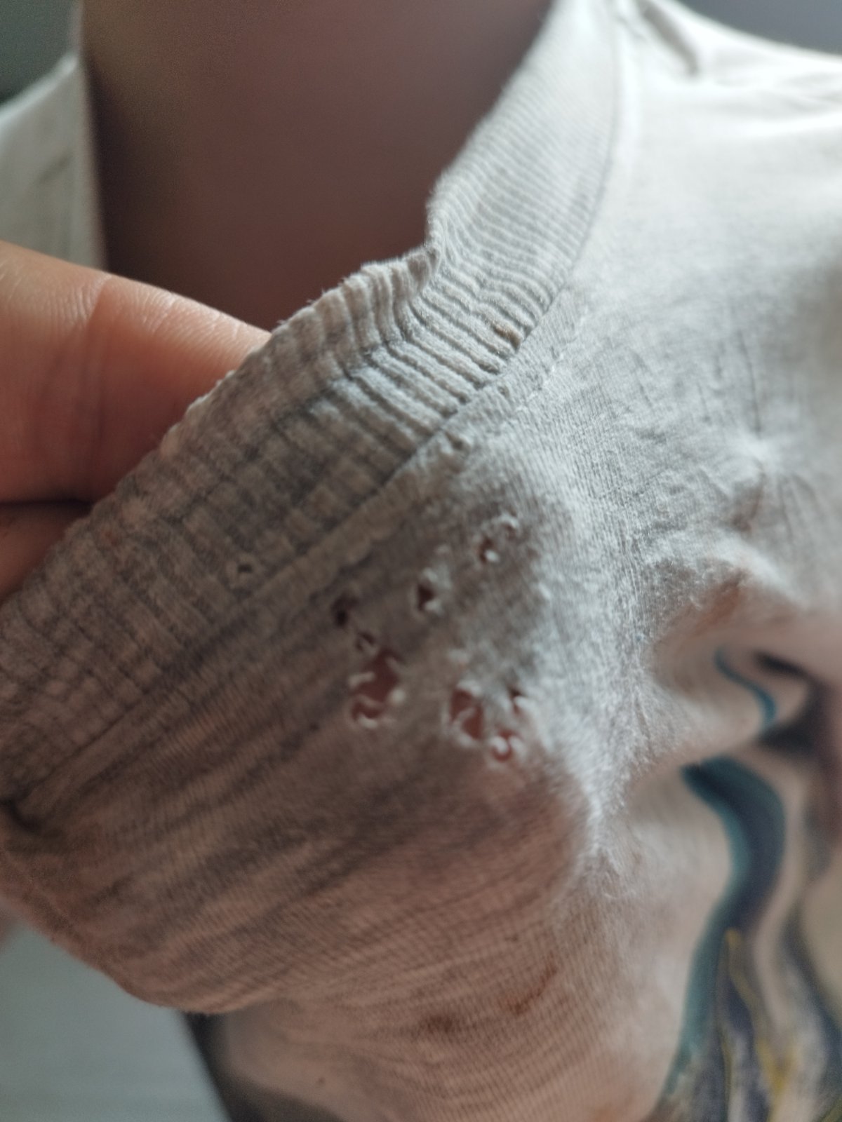 Tak dlouho to žmoula v ruce. Aš tam je díra a s díry je pak Mega díra. Že to pak nejde ani zašít. Kupuji mu každý měsíc nové trička ať nechodí do školy jak šupak. A ty staré se snažím zašit. Když to jde a mám na to čas. A syn má 9 let a už to dělá asi 2-3 roky. Čekám kdy ho to přejde