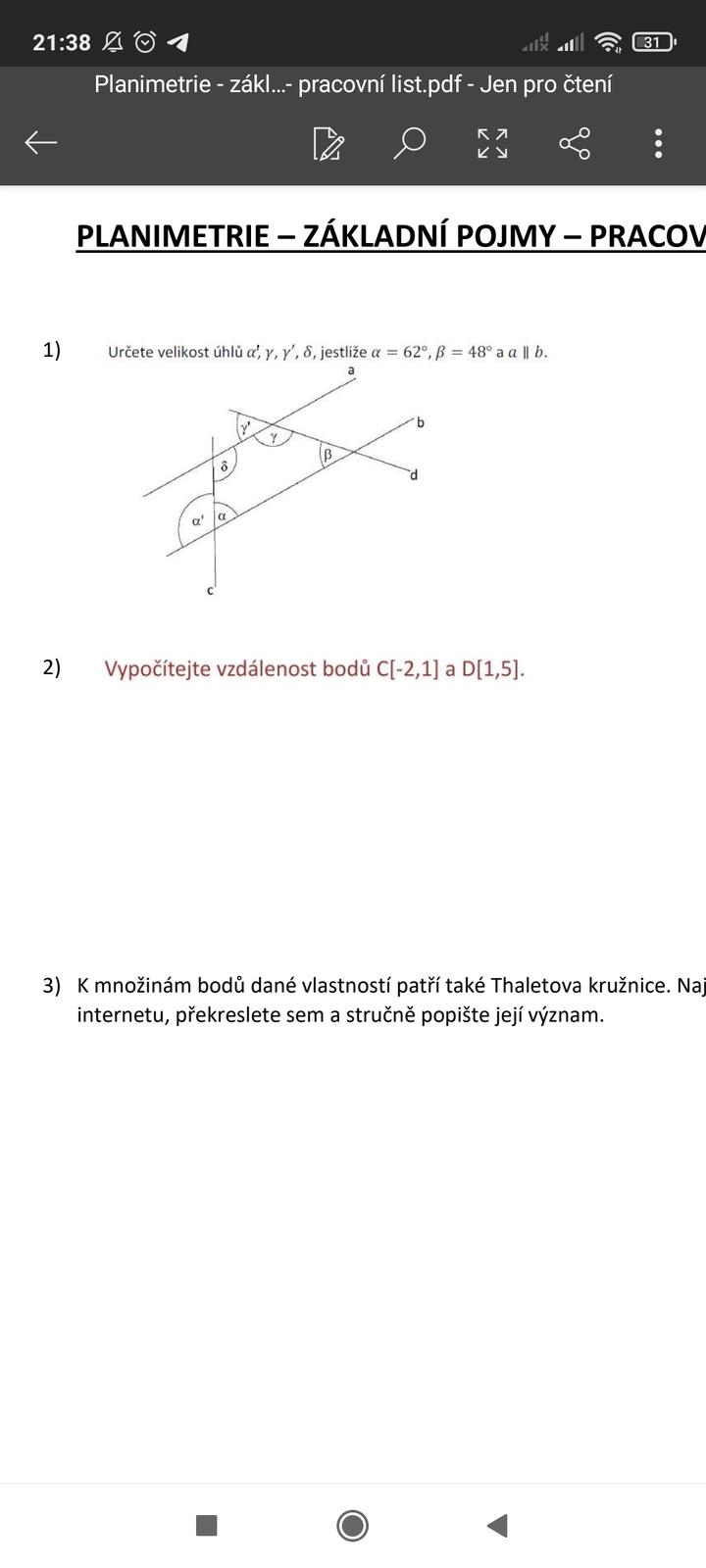 Potřebovala bych poradit s tou jedničkou. Jestli na to jdu správně? Úhel alfa s čárkou bude 118°, protože úhel alfa je 62° a jelikož tyhle dva úhly jsou úhly vedlejší, musí dávat dohromady těch 180°? Úhel gama je 132°, protože zase Beta a Gama mají dávat dohromady 180°. Úhel gama s čárkou by měl být 48°, protože gama a gama s čárkou jsou vedlejší a ty dávají dohromady 180° . A zároveň Beta a Gama s čárkou jsou úhly souhlasné, takže musí být stejné. A poslední úhel omega by měl být podle mě 118°, protože úhel Alfa a omega se rovná 180°.