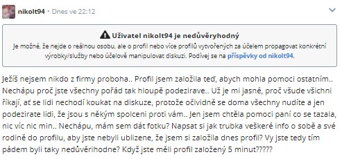 Ježíš nejsem nikdo z firmy proboha.. Profil jsem založila teď, abych mohla pomoci ostatním.. Nechápu proč jste všechny pořád tak hloupě podezirave.. Už je mi jasné, proč všude všichni říkají, ať se lidi nechodí koukat na diskuze, protože očividně se doma všechny nudíte a jen podezirate lidi, že jsou s někým spolceni proti vám.. Jen jsem chtěla pomoci paní co se tazala, nic víc nic min.. Nechápu, mám sem dát fotku? Napsat si jak trubka veškeré info o sobě a své rodině do profilu, aby jste nebyli ublizene, že jsem si založila dnes profil? Vy jste tedy tím pádem byli taky nedůvěrihodne? Když jste měli profil založený 5 minut?????