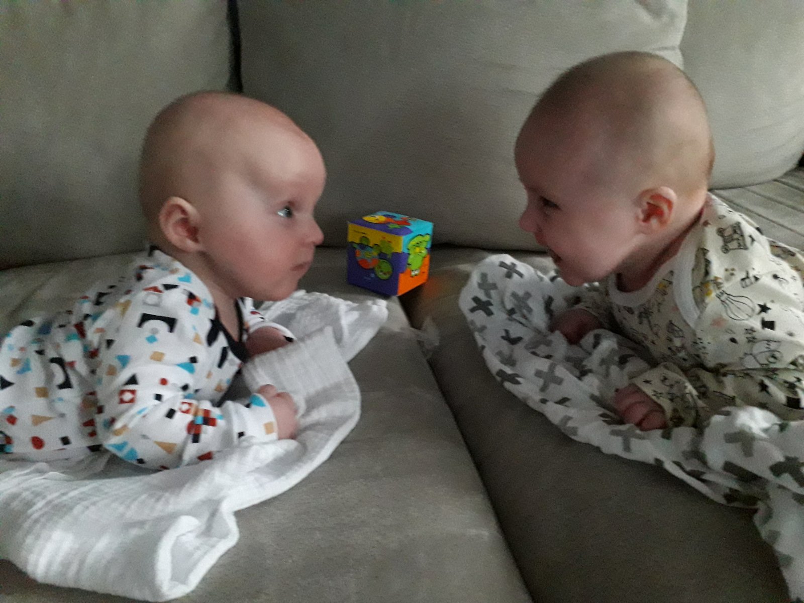 My paseme uz krasne. Domik je uz i stabilnejsi, ze zacatku se protacel na zada, jak je smrnclej do strany. Uz druhy den se snazi protocit ze zad na brisko. Staci uz jen malicko. A Vikinka ta kdyz vidi na brachu, nebo ma pred sebou zrcadlo tak se snazi jakoby plazit. Preklada rucicky a nozky. U nas velka sranda koukat do zrcadla, mam ho za prebalovakem a to se furt koukaj, nebo se o to pokouseji. To same televize, jak muzou z lehatka vykoukaji a tlemi se.