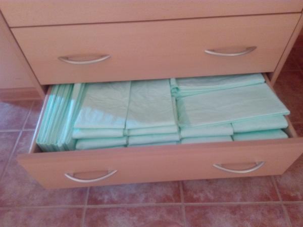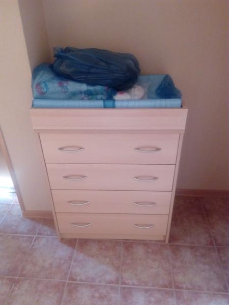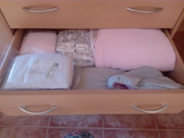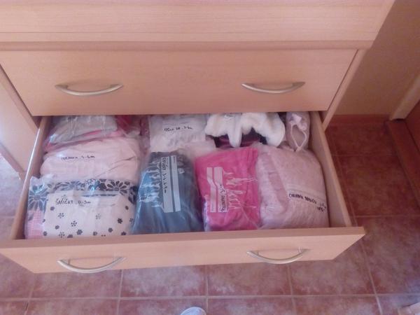 První dva šuplíky oblečení, botičky a dudlíky, třetí suple zimní fusak do autosedačky, deka, spací pytle, pleny a prostěradla a poslední suple jednorázové podložky, ale to tam budu mít asi na půl s plinkama jednorázovými.