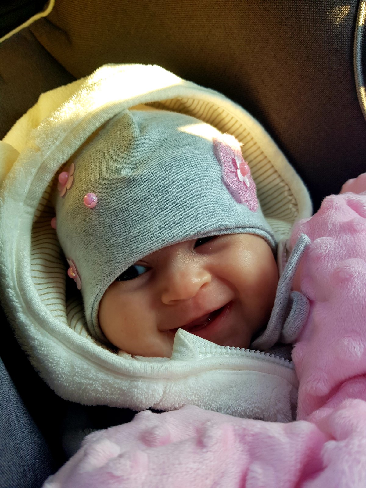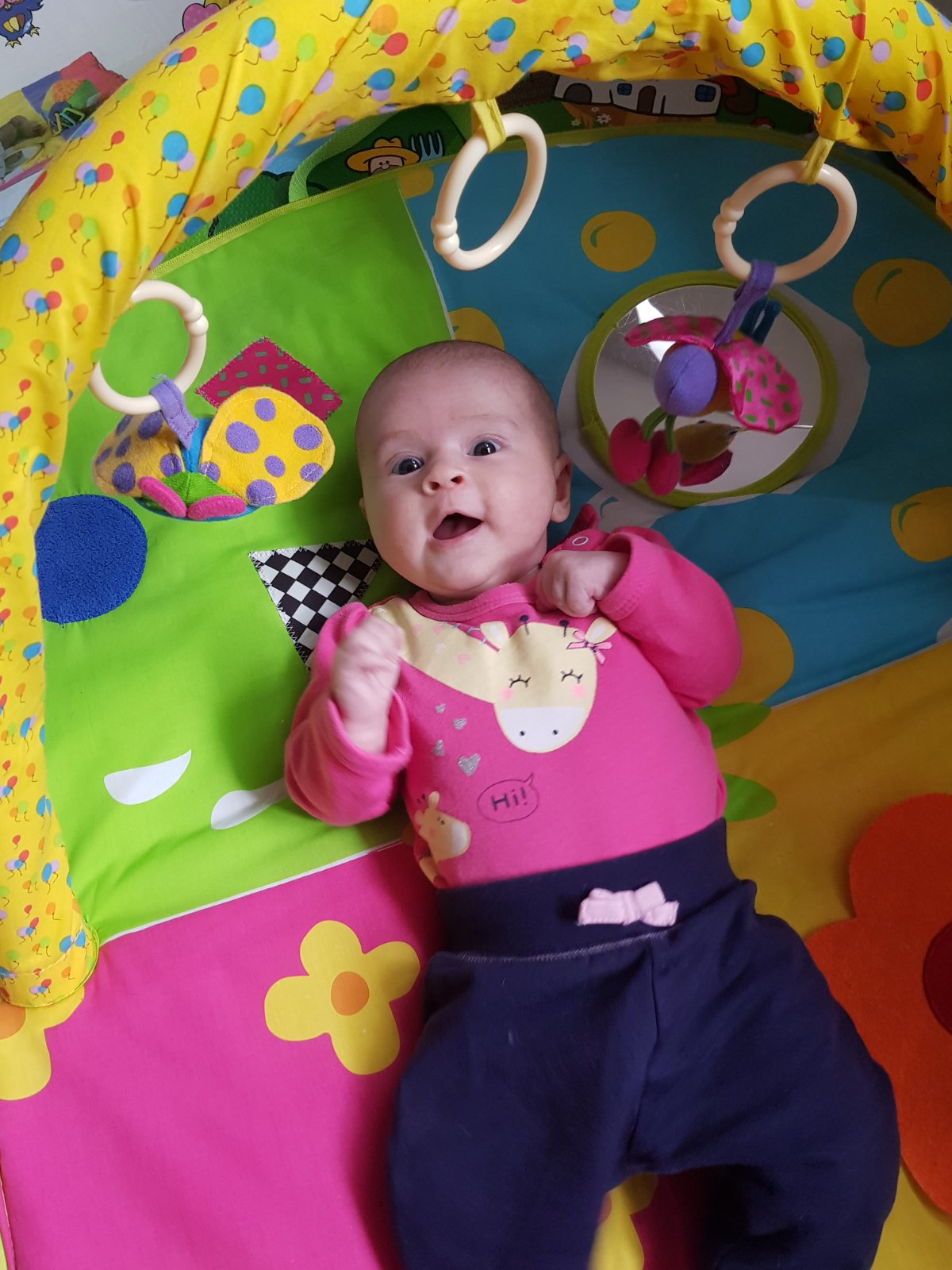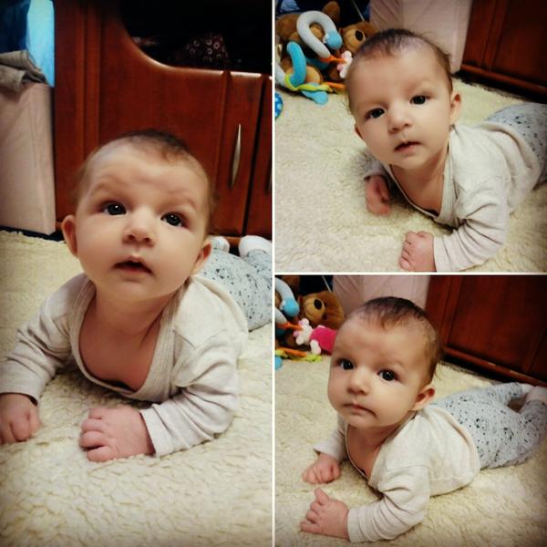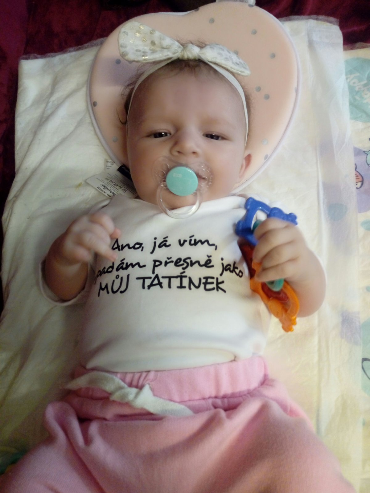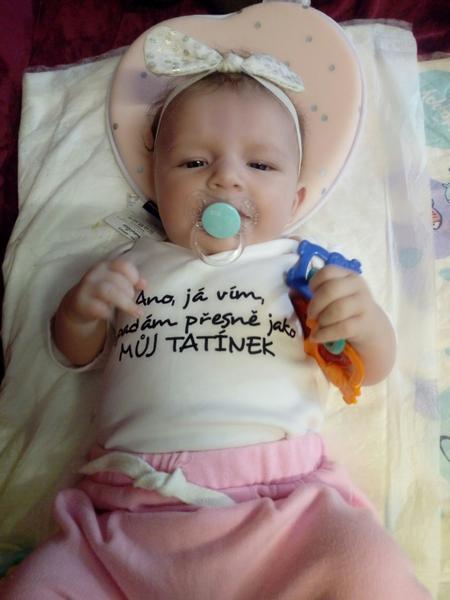 Ahoj holky, krásně vám mrnousci rostou!👌 Elianka bude mit za 4dny tri mesice. Chyta si hrackyji uz i sama a dnes se snazila dostat i na bříško. Zatim se sekne vzdy na boku. 😁 Je to vysmate slunicko. Smeje se na hlas, plive sliny =D a umi se tedy i pekne vzteknout. Hlavně kvůli tomu, ze jito nejdou papat hracky. 😁👌 Vse strka do pusinky a pestickama si jezdi po dolnim patre, tak uvidime, kdy vykouknouse zoubky....
