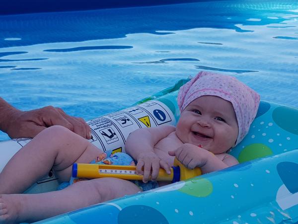 Naše bobina v bazene 🙂😃 do vody moc ne ale na lehatku by byla nejradsi porad. Holky dneska chcipneme v byte mame 31 ..