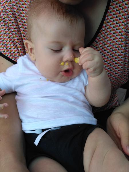 Dneska jsem byla v době oběda venku tak jsem koupila v dm bio skleničku s dýní a na to mi hodil bobek a počkal si doma na cuketu tu valil ještě víc jak včera. Tak zkusím ještě zítra. Odpoledne jsme koupili kukuřičné křupky a vytáhli jsme je venku v hospůdce ať ho zabavime a ten se chtěl zbláznit jak mu to jelo 😂
