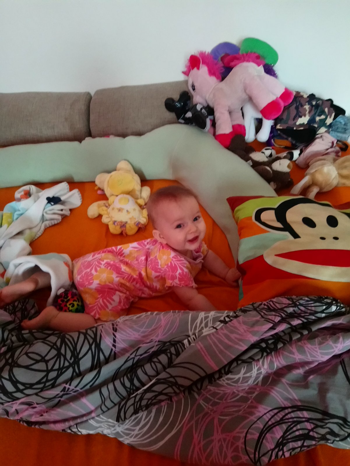 Krásné ráno holky. Rozka k ránu už spí se mnou v posteli. Kdybych ji po kojení presouvala, vzbudí se. Ale cestuje už po posteli, tak se bojím že mi jednou spadne. Máte někdo nějakou vychytavku co s tím. Zatím to mám vyřešené takhle, ale to jí už dlouho nezadrzi. (toho bordelu za ní si nevsimejte, to jí sem starší nosí svoje hračky)