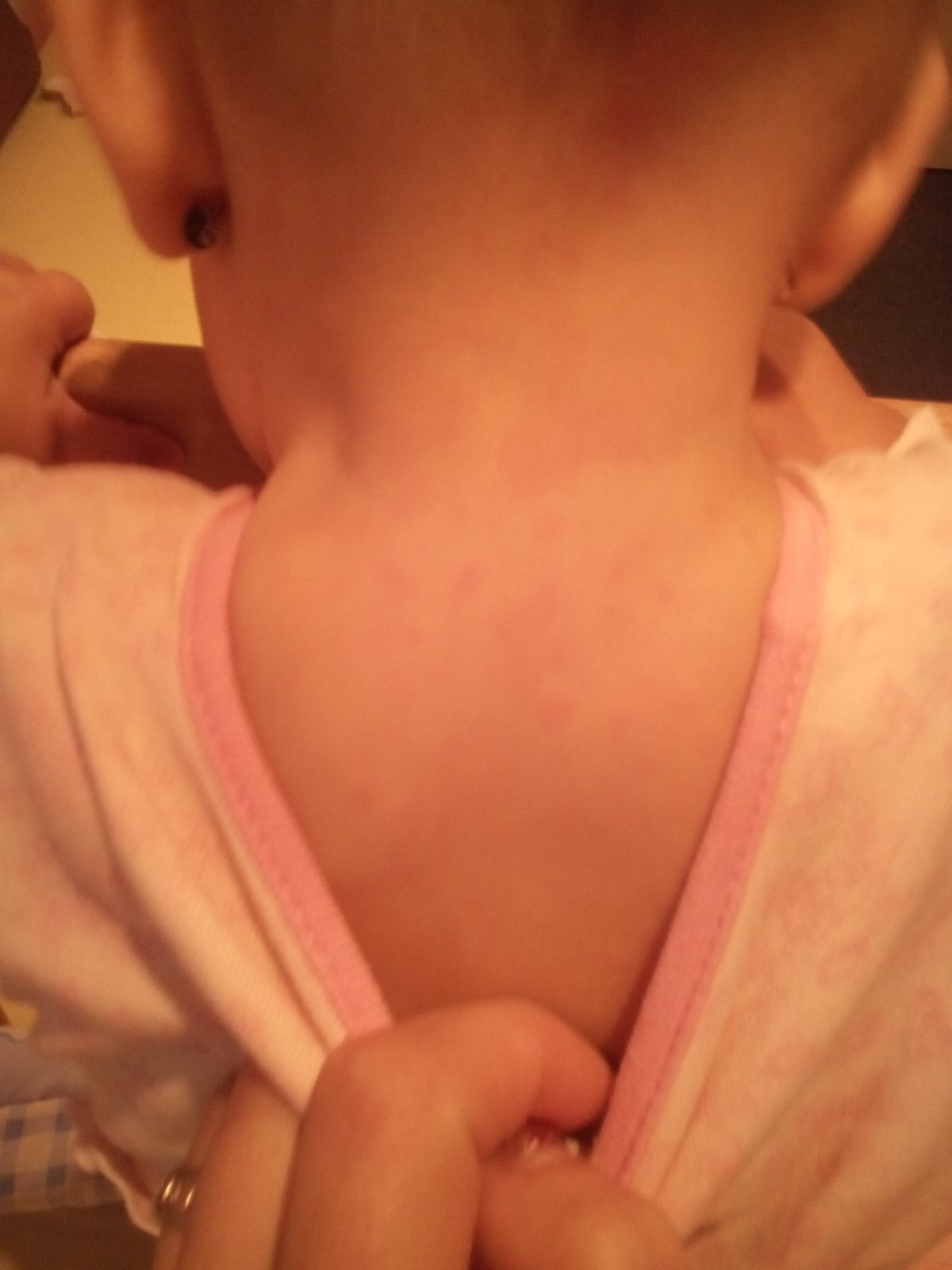 Holky já mám dilema jestli být za gysterku nebo ještě počkat. Od včerejška, nevím přesně kdy během dne, má malá nějakou vyrážku. Nic nového nejedla, jediná změna je že jsme nebyly jako vždy skoro celý den venku a byly jsme na střelnici kde byla na zemi na dece v kanceláři u správce. Netuším kde k tomu prisla ale začalo to na hlavě a krku ale už se to objevilo i na rukách, bříšku, zádech a nohách. Teplotu nemá... Tak nevím...