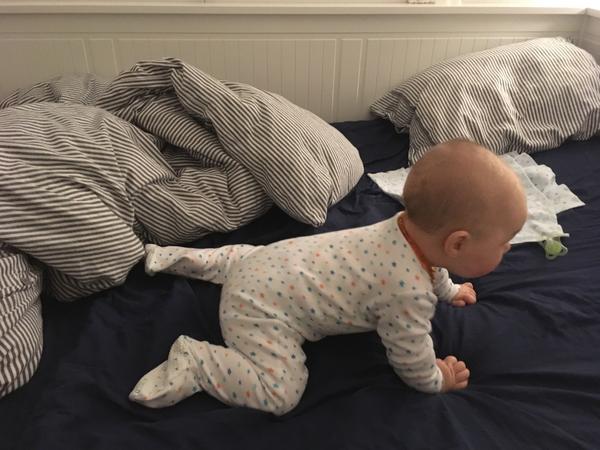 Holky Eliášek se už přetáčí hodně rychle na bříško a už i péruje na kolinkách. Leze po zadu jako píďalka🤩