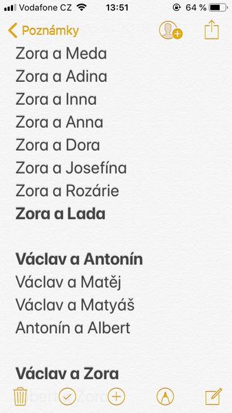 @bombat Mám ráda ve věcech pořádek. 🙂 Tak teď trošku trpim doma, když přehlížím ten šílenej bordel, co tady máme. Ale zdraví dětí mi je přednější, než abych si tady uspokojovala svoje obsese. I když mi to někdy ujede, hlavně ve chvíli, kdy si řeknu, že udělám jenom tohle a pak nemůžu přestat.. :D Lepší na nic nesahat. No ještě je tady jedna věc s těma jménama. Vojtěch i Zora jsou slovanská jména, tak by se mi líbilo, kdyby bylo i to třetí. Jako není to úplně mega nutný, ale bylo by to fajn. I proto má Václav trochu na vrch.
