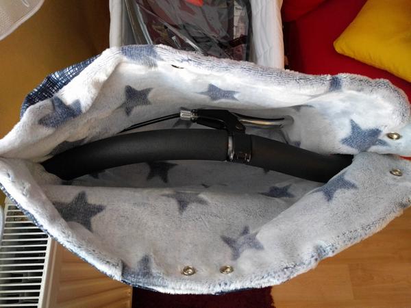Jinak jsem sedla zase ke stroji konečně a udelala ten rukávník. Nakonec se vejde i ta brzda, ale musela jsem si střih oproti standardnímu trochu prodloužit 🙂