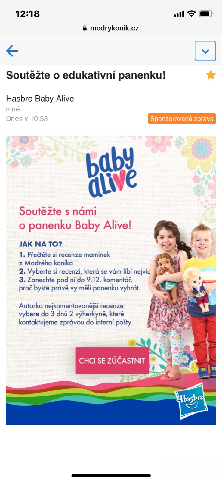 Ahoj holky. Mam tady na koniku článek a recenzi na panenku. Kdyz mi pod to hodíte komentar nejakej a budu jich mit nejvic muzu vybrat dve maminky které dostanou panenku take. Tak pište 🙂) https://www.modrykonik.cz/blog/yvonneullmann/article/testovani-panenky-babyalive-qha725/