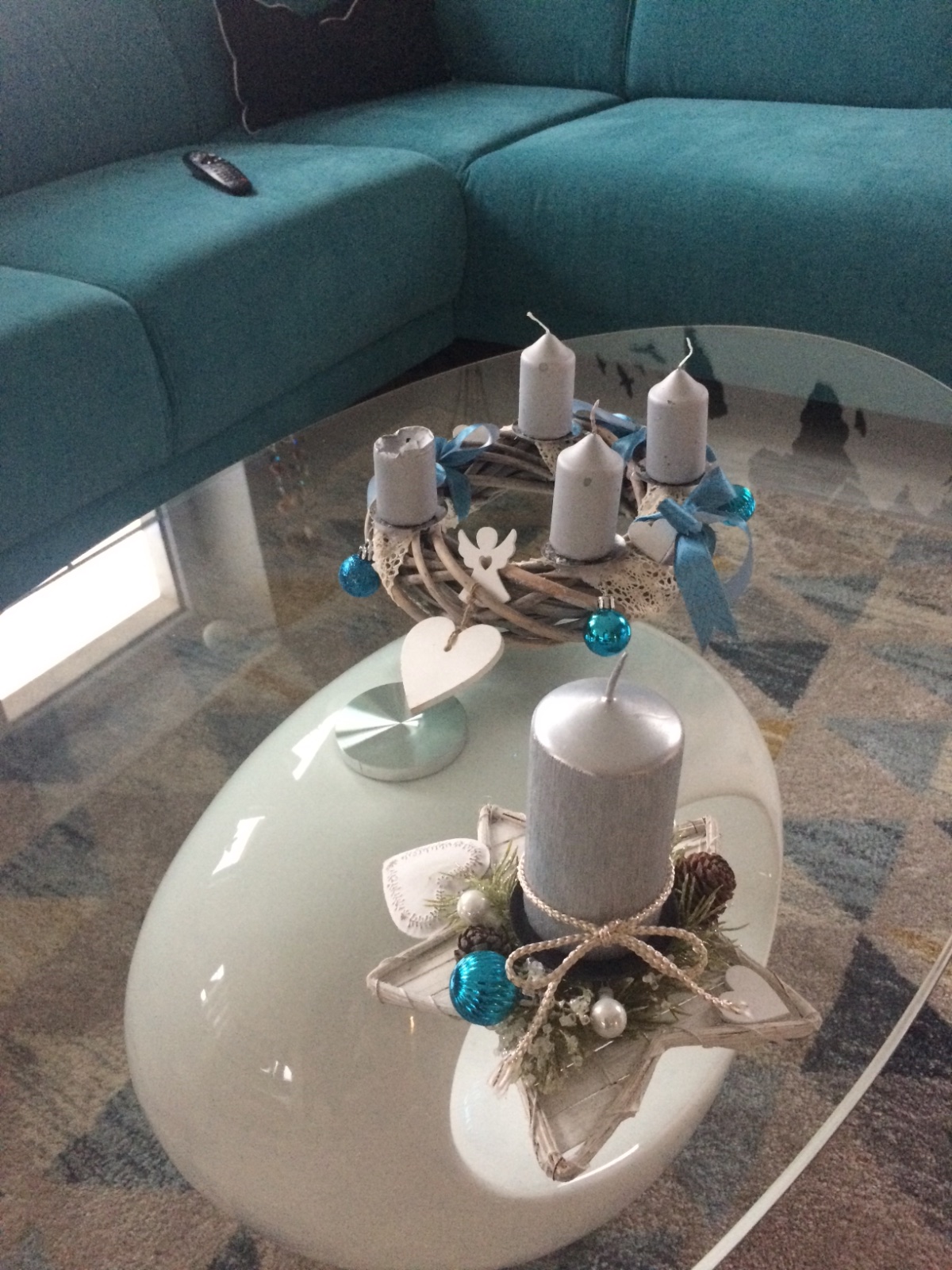 Začala jsem něco málo píct a výzdoba je pouze věnec a svícen...jo a ještě čekám, že prijdou svetýlka z Ali...