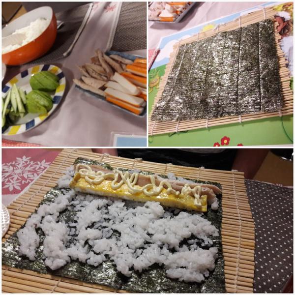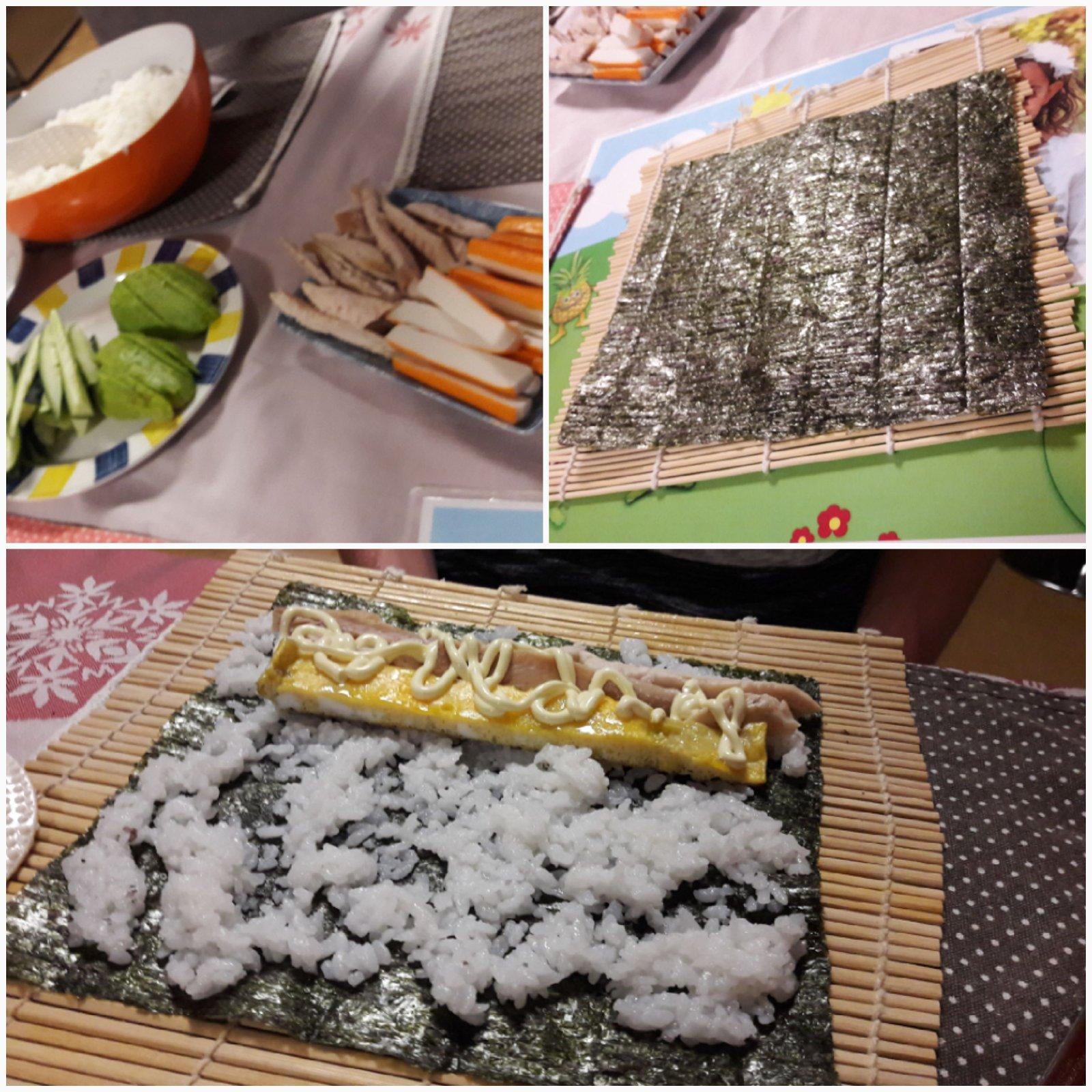 Sushi jsme minulý víkend vyráběli doma, rybu jsem si tam dala uzenou + uz. losos a zeleninu a vajíčko, lahůdka plně chutě uspokojujici 🙂