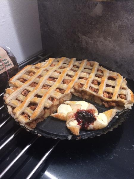 Formu vytřeš a vysypeš moukou a vyložíš rozváleným těstem. Mezitím si nakrájiš oloupená a vyjádřená jablka na kousky, dáš do kastrulku, na másle necháš zkaramelizovat s cukrem, skořicí a nasekanými ořechy, vše dle chuti...je to takový recept od oka. Pak nasypeš do formy a navrch vykrájíš proužky, které potřeš rozšlehaným vejcem. Pečeš na cca 15 min.