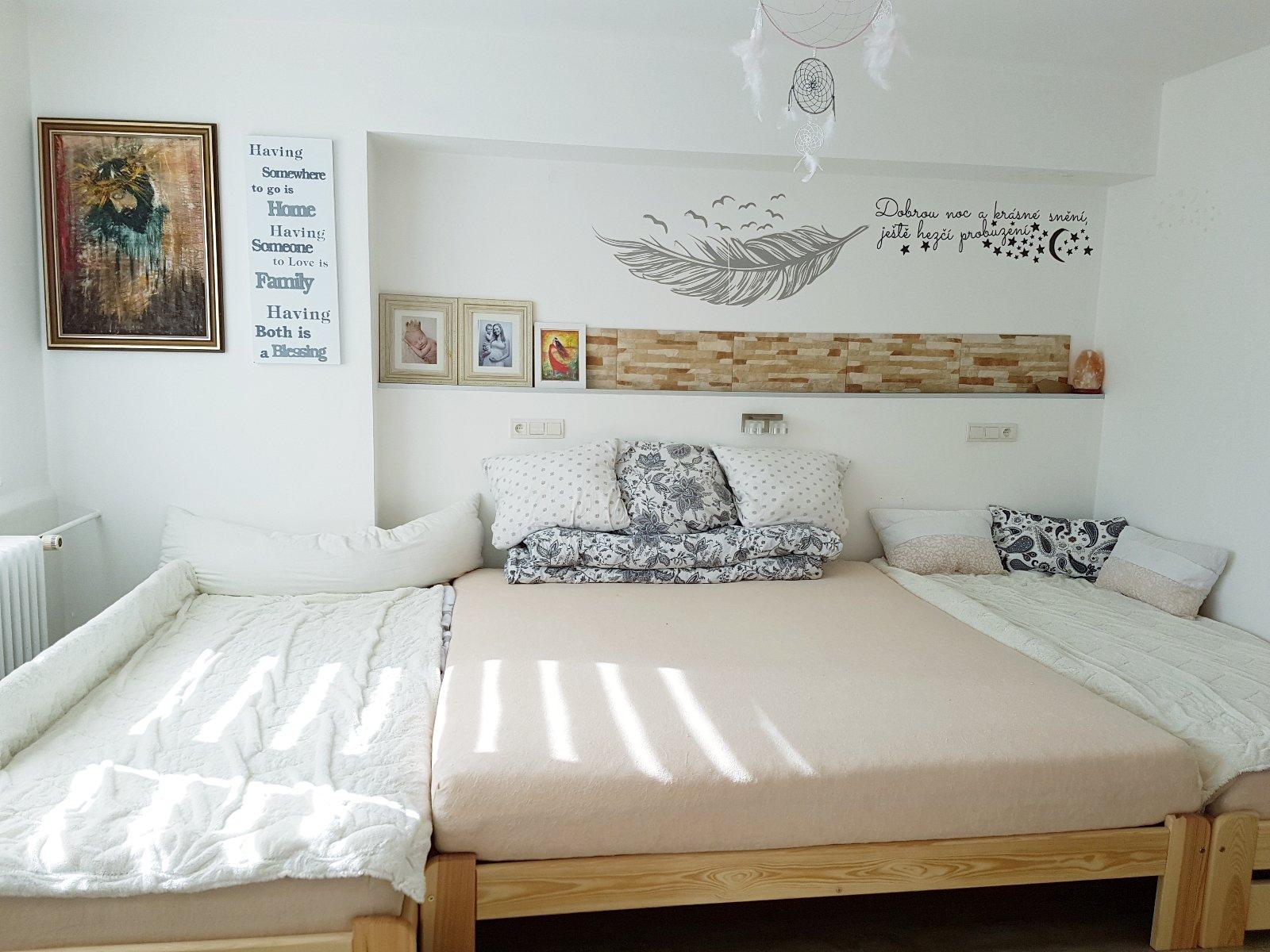 @andelka My máme naštěstí "ložnici" dost velkou 🙂 Pak tam bude jeden z pokojíků 🙂 Máme tam naše letiště a po bocích postýlky a jeste tak 2,5 m x 3m místa 🙂 Takže tam ke zdi umístíme i tu postel pro starší 🙂 Až povyroste mladší dcera, tak půjdou do svýho pokojíčku 🙂