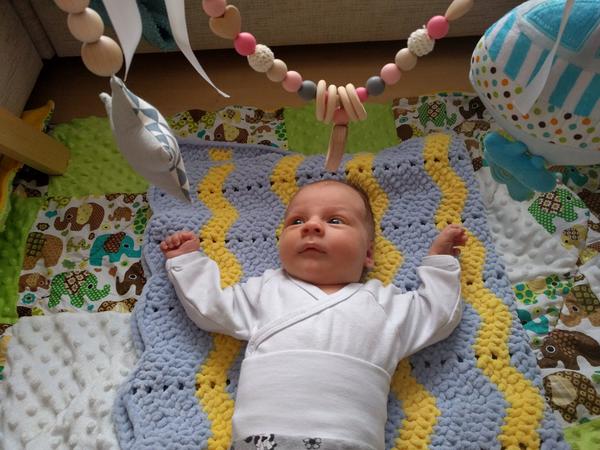 Naše malá už začíná přes den docela dlouho koukat. Chrastítko v ruce fixuje pěkně už delší dobu, tak jsme dnes vytáhli hrazdičku a začínáme si spolu hrát 🙂