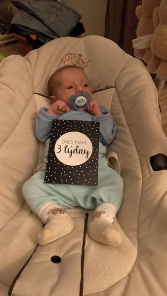 Tak náš Péťa bude mít ve čtvrtek měsíc a má nyní cca 3,5 kg (odhad z toho, když se vážím s ním a bez něj, na kontrolu jdeme až po šestinedělí) a délku jsem neměřila. Porodní váha byla 3010 g. Naše pediatra říká, že by měli přibírat 150-300 g za týden, tak snad to aspoň trochu splňujeme. Je mi divné, že Vám všem děti vyžadují časté a dlouhé kojení, náš malý se kojím po dvou hodinách vždy tak 10-15 minut a stačí mu to, hlady vůbec nepláče, tak nevím, jestli mu nedávám málo....Koníčky se snaží pást i bez hračky či nějakého podnětu, ale dost často zvedá hlavičku úplně vytočenou do jedné strany a to se bojím, že si přetíží krční páteř ☹ Zároveň si na tom bříšku pořád pomáhá nožičkama a strká je pod sebe...včera první vědomý úsměv, ale od té doby zase nic 😀 posílám fotky z minulého týdne 🙂