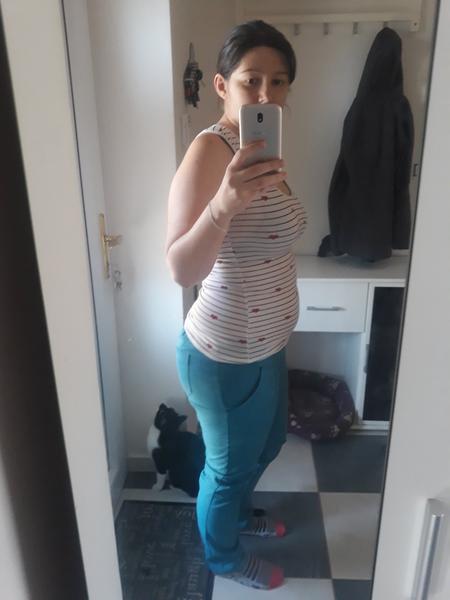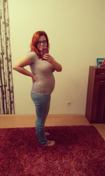 Naštěstí mám pořád svoji sloní 44 a tak nosím legíny a šaty. Koupila jsem si zatím jen 2 těhotenské legíny z lidlu, ale jsou mi ještě velké. Nemám odvahu objednávat z netu nebo bazaru 🙂 Ze srandy jsme si s přítelem měřili obvod pasu, tak už má méně, když přestane dýchat a zařeže si metr 😄