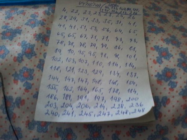 7,11,21,37,41,50,51,59,71,75,77,80,81,83,86,90,100,107,109,110,111,117,137,141,150,161,183,191,200,201,221,225,227,231,247(některé vícekrát)
