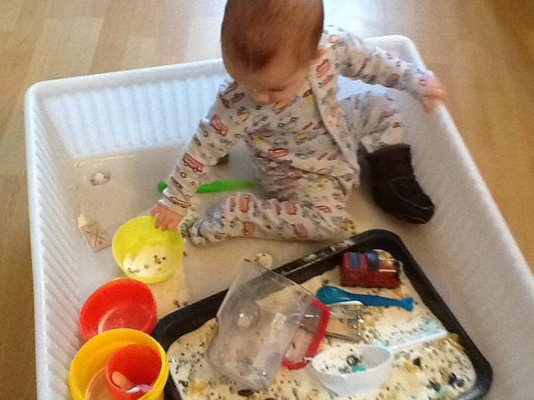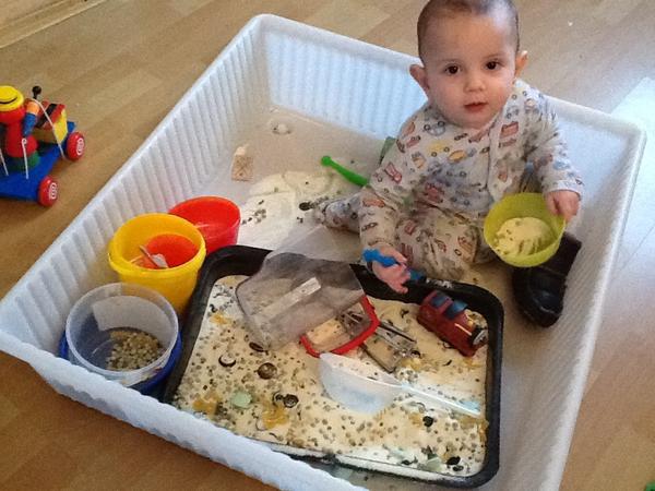 Holky a vřele doporučuju pro batolata domácí "pískoviště... U nás naprostá bomba, krásně se tam zabavil, jako třeba teď a já si tu můžu v klidu vykecávat😀. Kluci to milují oba a kupodivu to není až tak úplně šílený na bordel😀. Mají v tom krupičku (nakoupenou prošlou ve slevě😀), fazole, hrách, těstoviny... Si to vše smíchali a patlají se v tom, přesívají, přesypávají....)