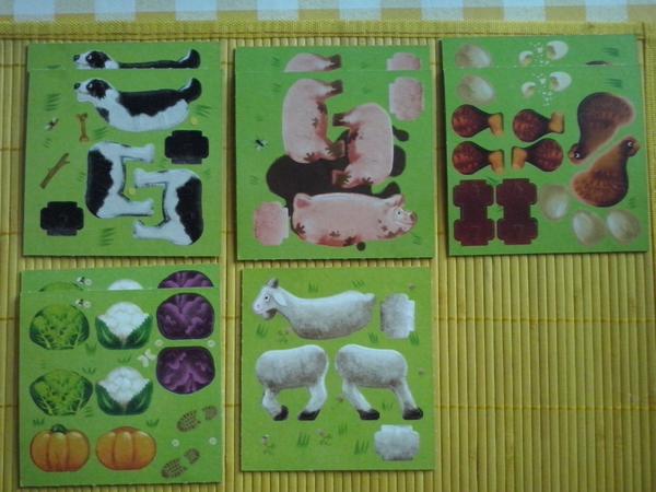 (zelí-květák-dýně),2x kačky, 1x ovce,4x husy,2x nádoba na mléko,5x pes,1x kohout,3x slepice,3x strom hrušeň,