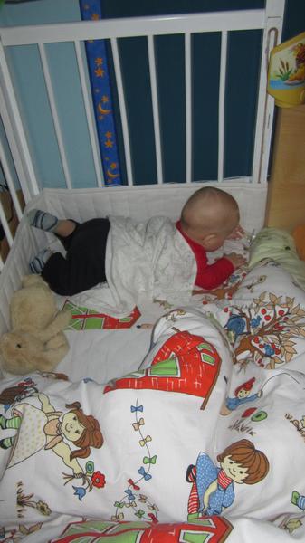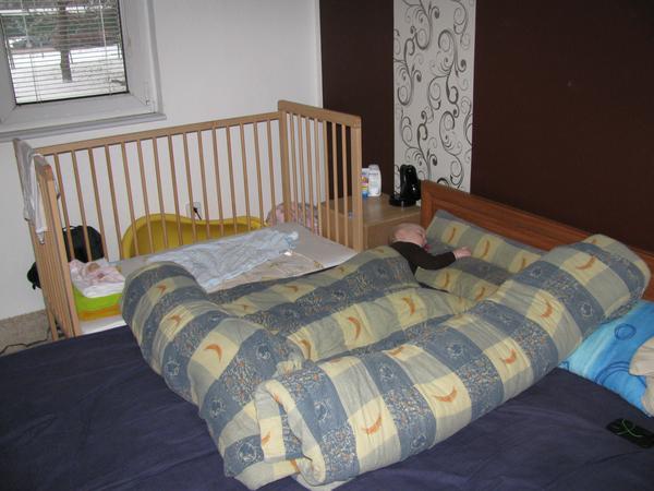 k té postýlce - u nás se spinká takhle. ale všechno špatně - dítě má pod hlavou polštář - usnul při nalívání se čajem), vidíte mé jediné světlé povlečení (ano, mám i černé:o)))) ) a v pozadí exkluzivní tři dny nová chůvička! i přes moje protesty ji manžel koupil. prý ho obtěžuje, že si večer nemůže pustit televizi nahlas (tzn aby to řvalo jak na lesy) a že nemůže děcko zavřít. tak už tři dny trpím zavřené dveře a chůvičku 😠
