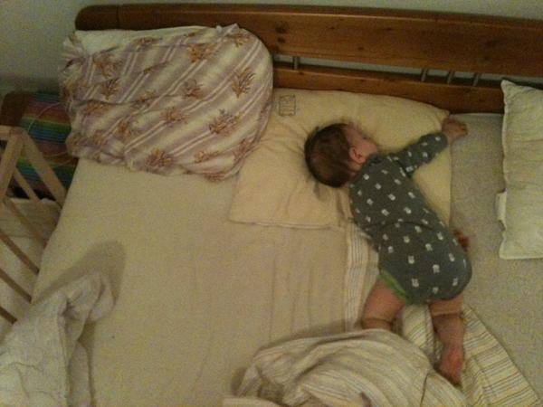 Jak jste tu řešily to spaní - takhle je to u nás (postýlka slouží jako zábrana proti skulení z postele, když malá usne na kraji (mám druhém boku)