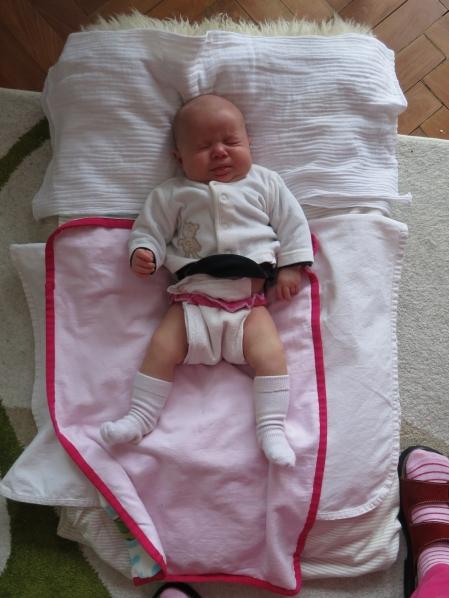 Takhle občas mívám Barborku, ale většinou je normálně oblečená a zaplínkovaná, protože se odkopává. Přes den si hoví v obýváku na pelíšku z kožešiny. Přebalovací podložku jsem si šila, i plenkový pásek.