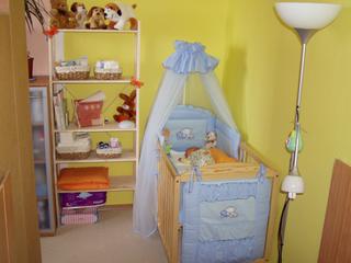 Ahojky modra_slunecnice 🙂 Tak my to máme vyřešené tak, že nám ten jeden pokoj rozděluje obývací stěna a za ní máme manželskou postel a postýlku, už jsem to asi 3x přemisťovala, mám ráda změny, ale jak bylo miminko tak mám fotečky. První je jak to vypadá z boku (průchod mezi obývací stěnou a ložnicí 🙂 druhá je pohled z ložnice (ještě není dodělané obložení a na zadní stěnu obývací stěny jsme dali tapetu, ať to vypadá líp) a pak pohled ode dveří (to je novější fotka, už to máme zase trochu jinak). Tak pro inspiraci 😉 Ale klidně bych to oddělila nějakou větší policovou knihovnou nebo příčkou.