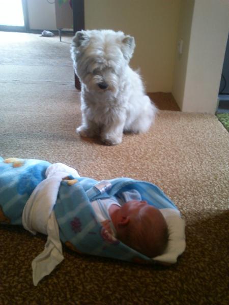 Když se narodil prcek, tak Komínovi ( westovi ) byl rok a půl. Super chůva, jak Bobeš v ložnici zaječel, už pro nás KOmín běžel, at si toho řvouna uklidníme 🙂 teď je BObešovi skoro 6, jsu to nejlepší parťáci, nechci domyslet, až KOmín nebude.. Tedy celé těhotenstvíjsme Komína na mimino připravovali, zní to blbě, ale tahali ho za uši, ocas, naučili ho, jak mu bude něco nepříjemné, že se má uklidit pod gauč a tam je jeho místo, neexistuje, aby ho tam někdo rušil. To Bobeš ví od malinka, že tam se neleze. A štěkání? Nevadí - Komín moc neštěká, a to párkrát štěknutí - no co, tak dítě usne znovu.. z toho se nestřílí..