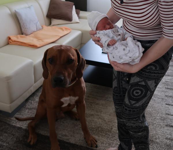 Máme křížence labradora a švýc. ovčáka. Psi už když jsem byla těhotná tak to věděli a začali mě hlídat o to víc. Podle rad odborníků jsem malou jak jsem přijela z porodnice položia v sedačce na zem, aby si jí psi mohli očuchat, bála jsem se, aby jí neublížili, ale úplně naopak, suprově jí přijali a hlídali jí na střídačku u postýlky, štěkat dokonce když spala začali až u dveří a malá si jak na štěkot tak na studené čumáky zvykla strašně rychle. Teď jsou to její kamarádi a úplně v pohodě. Držím palce