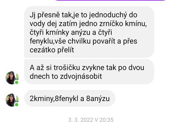 @nock přikladam foto receptu, který je prý 100x lepší jak fenyklový čaj. Ještě jsme zkoušeli kmínový odvar. 10zrnicek kmínu na hrnek vody. Malou lžičku odvaru jsme prodávali do mlíka zbytek jsme pili my. Dále nám nejvíce pomohla mastička pupík