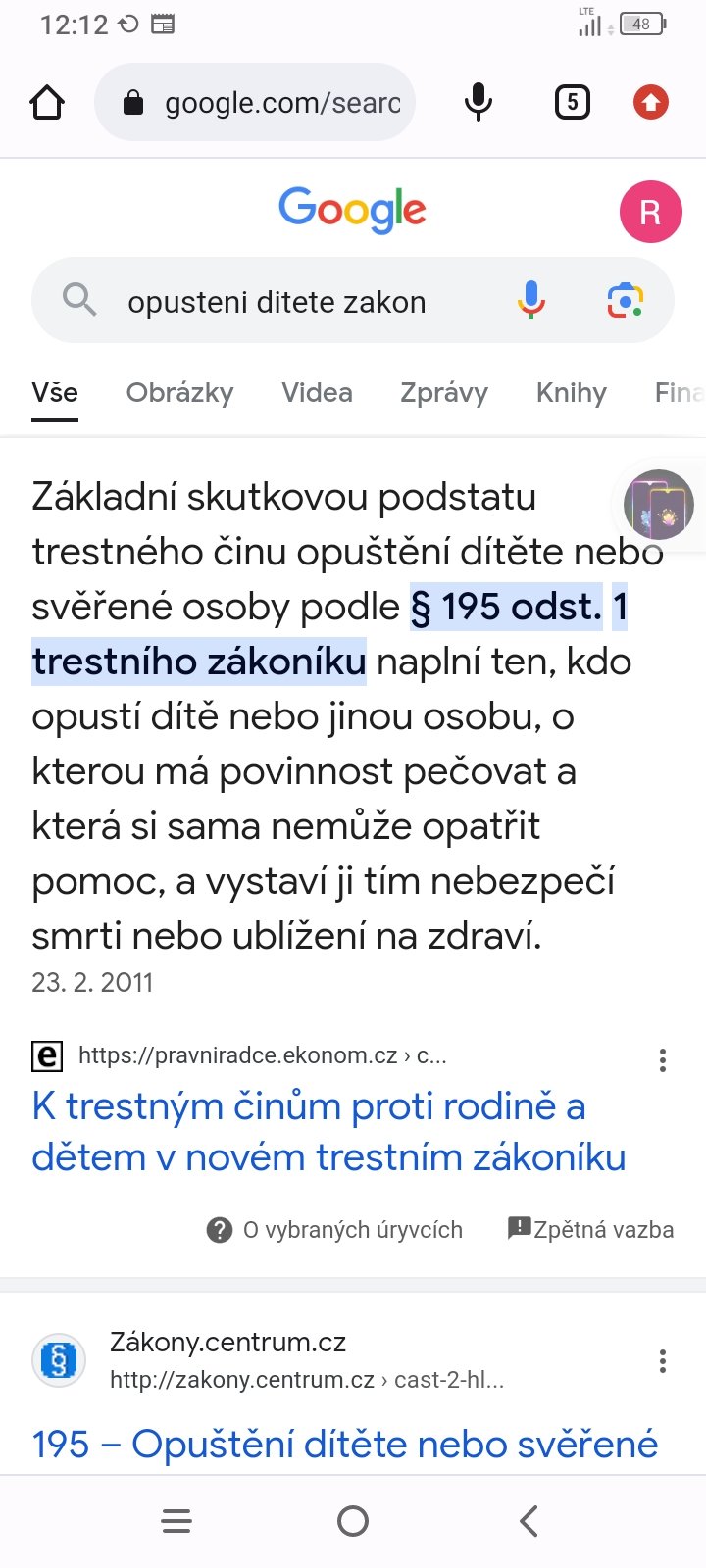 Nikdo z normalnich matek samozrejme nema v planu sve dite zabit, ze jo. Ale vicenasobna matka musi hledat jakousi vyvazenost mezi obecne prospesnymi benefity a mirou rizika. Kdyz ma zenska tech deti vic, tak tohleto balancovani je dennni chleba. Jelikoz kazdy ma zrovna jine potreby. A to, ze mama odbehla naproti pro syna do skolky a mela VIDEOCHUVICKU (!!!) neni opusteni ditete. To by bylo, kdyby odesla na nekolik hodin chlastat do hospody a o decku by vubec nevedela.