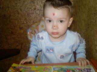 Foto je už z lepšího období, ale měl to na tom čele ca 4 měsíce. Kolikrát malému tekla krev po čele, jak to měl pořád rozškrábané...