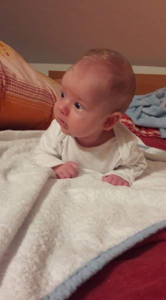 @amazonkajanik ano už v 6 týdnech vydržel třeba 3 minuty držet krásně hlavu. (na fotce v 6 týdnech). Dcera nemá vůbec žádnou snahu tu hlavu zvednout. Jen leží s hlavou na straně.