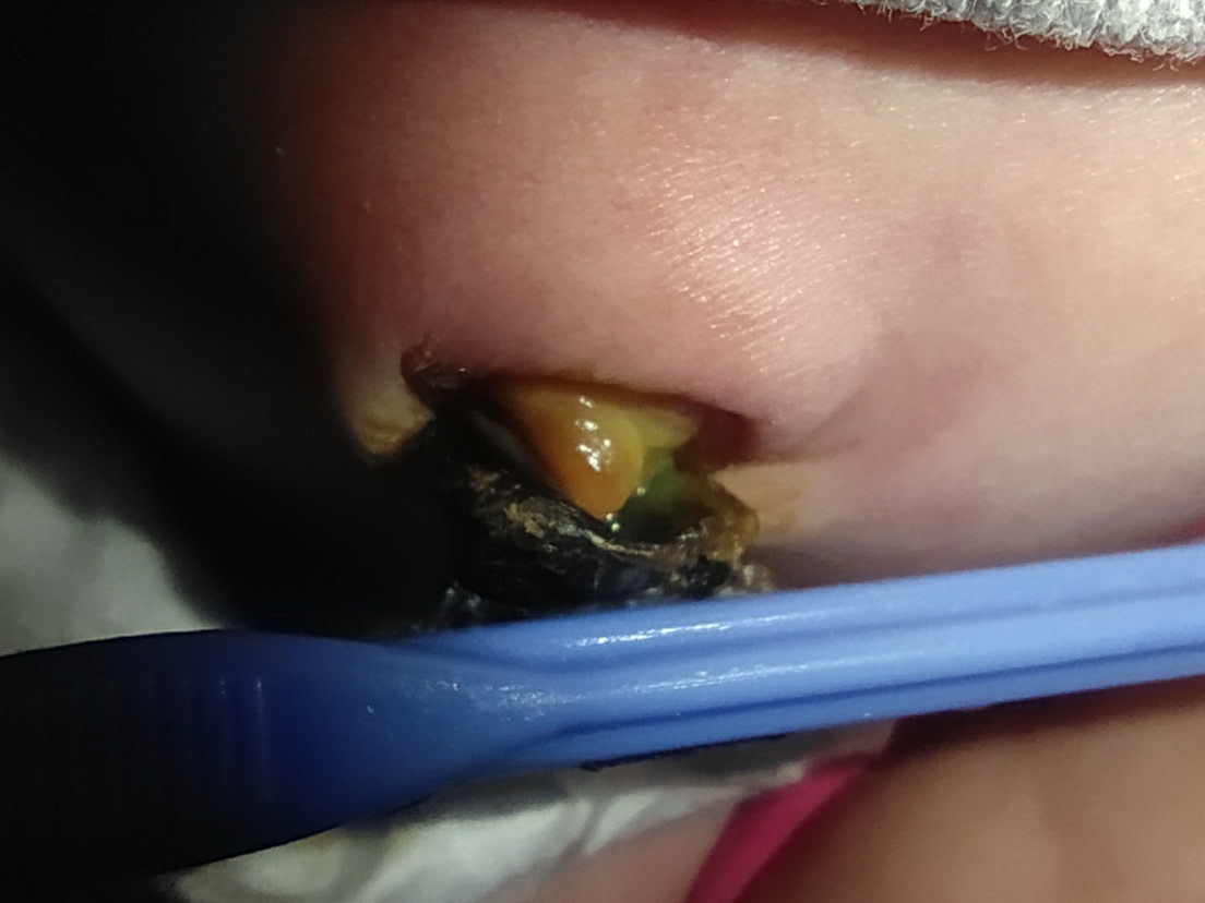 Občas se mi bohužel povede o to při kojení kůže na kůži zavadit a pak to má ještě ošklivější, včera večer to měla okolo i trošku začervenalé, jak jsem jí s tím omylem trhla, takže jsme mysleli, že s tím dnes pojedeme, ale dneska začervenání naštěstí zmizelo a plánovanou kontrolu máme v pátek, tak počkáme...