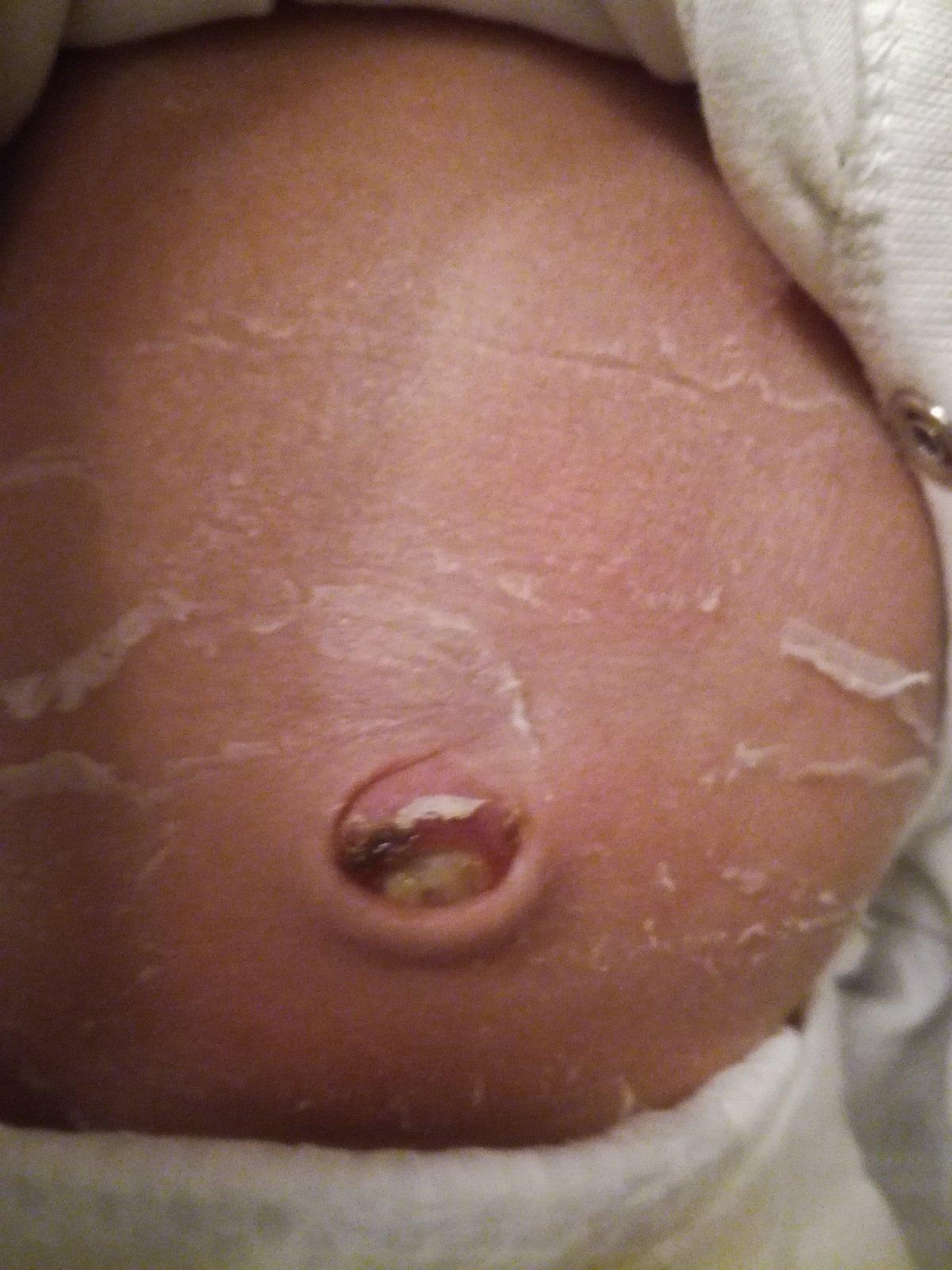 Pupeční pahýl, pod ním to je "čerstvé"