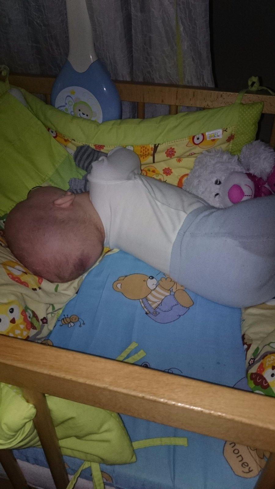 Tahle poloha je také synova oblíbená. Nechápu jak tak může spát, ale nechávám to na něm. Budou mu 2 a má to od malička 🙂