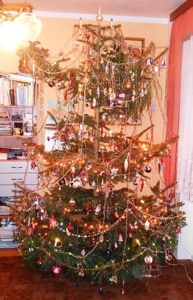 Naši pro nás taky zprvu zdobili stromek potají večer 23., když nás uložili. Když mi bylo asi tak sedm, tak jsem je při tom načapala, tedy jsme od dalšího roku zdobili všichni spolu (kromě maminky, ta říká, že na to nemá nervy) už třidvacátého odpoledne. Tatínek to pak po pár letech pojmul opravdu velkoryse, na zahradě založil minisádek smrčků právě pro vánoční účel a jal se je pěstovat do opravdu obřích rozměrů, které jsme do té doby znali jen z filmů hollywoodské provenience, jako např. Sám doma. Zdobení stromku, či vlastně stromiska, se tak pravidelně započíná ve tři a končí tak v osm. Nejdřív je nutno odklidit stůl a židle z koutu obýváku do sklepa, slavnostní sváteční stolování se tak odehrává u ministolu v kuchyni. Následně se do bytu dorve, a to doslova dorve, obrovitánský jehličnan, z něhož asi půlka jehličí cestou pokryje schody bytového domu souvislým kobercem. Poté za asistence celé rodiny (vyjma maminky tedy) instaluje kmen do stojanu tak, aby strom stál rovně, a dále se hledá ta nejkošatější strana, co bude směřovat do prostoru, nebo ta nejchudší, co bude ke stěně. Poté, co jest smrk bezepečně ukotven a správně pootočen, nastává čas uvařit si kávu a pustit si pohádku, neboť tatínek začne rozmotávat světýlka. Máme jich několik druhů, a vždy se najde souprava, která nesvítí a je tedy nutno ji opravit. Nejproblematičtější jsou památeční svíčičky bezmála padesátileté, z otcova dětství. Oprava žároviček zabere vždy minimálně hodinu a již párkrát se neobešla bez odkvačení do elektra pro součástky. Ovšem vždy, ťuk ťuk ťuk, se povede všechny světelné řetezy uvést do chodu a rovnoměrně na větve rozvěsit. Poté již může nastoupit kohorta nás dětí i s partnery a zvesela se zapojit do ověšování stromu ozdobami. Jde o dobově, typově, barevně, tvarově i materiálově nevyhraněnou směs ozdob pocházejících z různých zdrojů v různých stádiích ošoupanosti. Ty ošklivější se věší dozadu, jen aby tam něco bylo. Tatínek celý zdobící proces koordinuje ze štaflí, ze kterých instaluje špičku, hvězda se u nás neuchytila, a poté pečlivě vybrané kusy ozdob z jednotlivých kolekcí tak, aby dvě ozdoby ze stejné krabičky nevisely moc blízko u sebe. Vzhledem k rostoucímu množství ozdob (každý rok se musí koupit aspoň jedna nová) se tento požadavek jeví stále obtížněji splnitelný. Po ozdobách se do co nejhůře přístupnýc míst zavěsí také čokoládové figurky, které maminka dostává v zaměstnání jako vánoční prémii, ale stejně jich do Tří králů, kdy se odstrojuje, většina padne za vlast. Speciálním bodem programu je aplikace památečních ozdobných řetězů, sestávajících z pásků staniolu omotaných na niti, které jsou rok od roku opelichanější, ale dneska už se tak krásné stříbrné nedají nikde koupit, chápete! Za ta léta jich je několik už napevno do sebe zamotaných. Když jsou teda instalovány i řetězy, koštětem se výplod naší kreativity opatrně pošoupne do rohu na místo určení a na závěr se pohází stříbrným, modrým a červeným "sněžením". V tuto dobu opatrně opouští maminka kuchyň, aby zkonstatovala, jakou příšeru to tatík zase letos přitáhl, a že příští rok bude jen nějaký malý umělý. My ostatní se kocháme, neboť i přes všechny polorozbité baňky a povadlé řetězy je stromeček vždy čarokrásný a voňavý (teda kromě jednoho roku, kdy stromek čerstvě uřízlý a připravený k transportu do sklepa podělal kocour a my si toho všimli až při strojení).