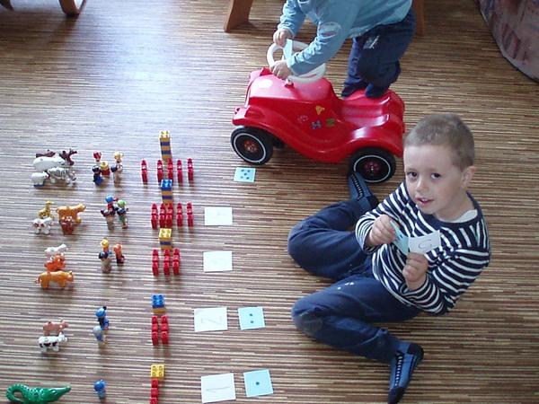 Kosticky jsou na počítání nejlepsi pomocník... Je malinkej tak to moc nechape ale musime se učit 🙂) vlacek by se nam moc hodil.